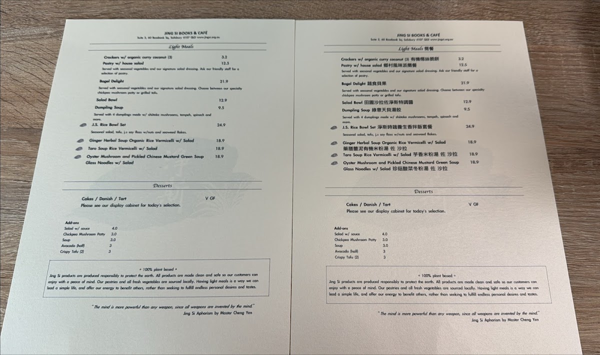 Jing Si Books & Cafe (Brisbane) 靜思書軒 Menu